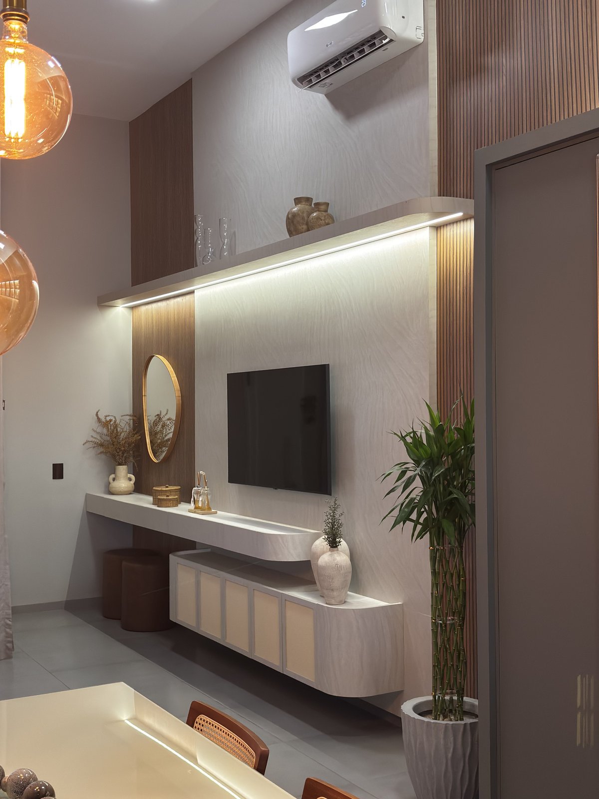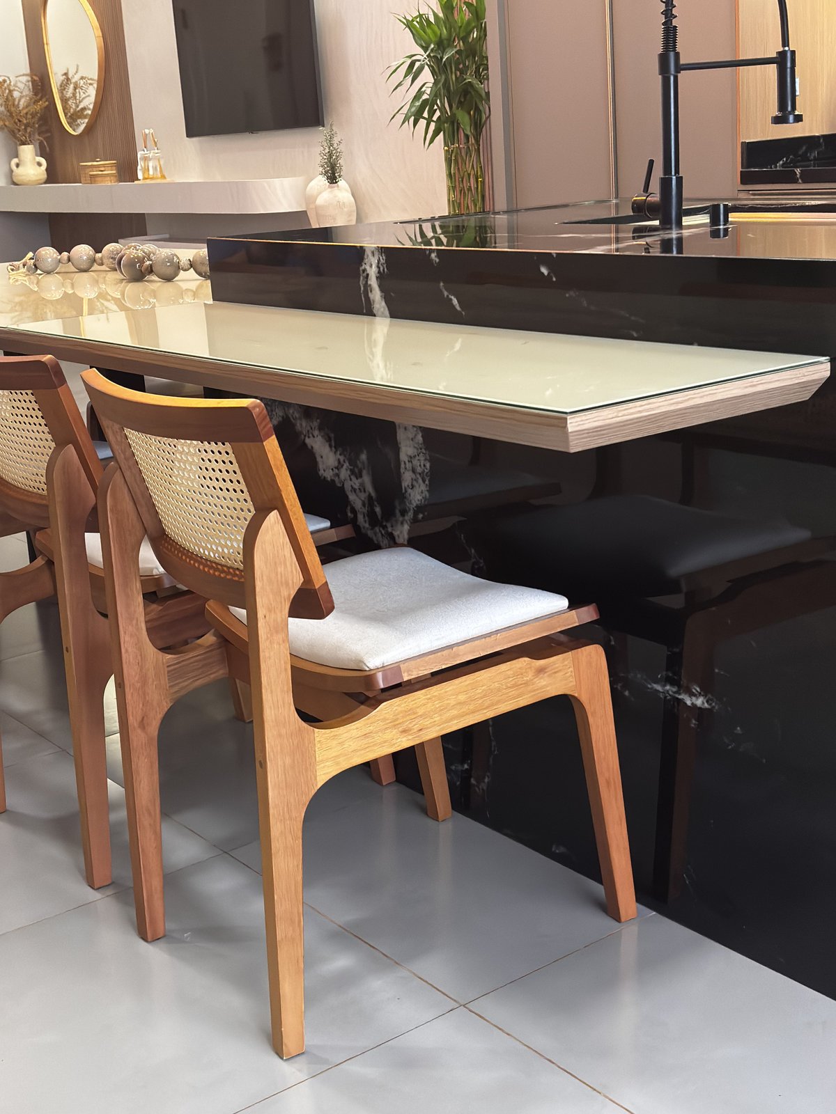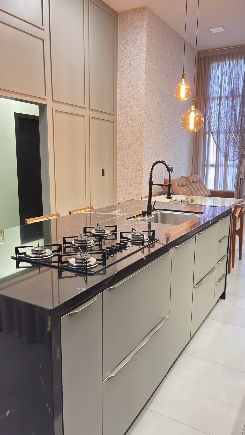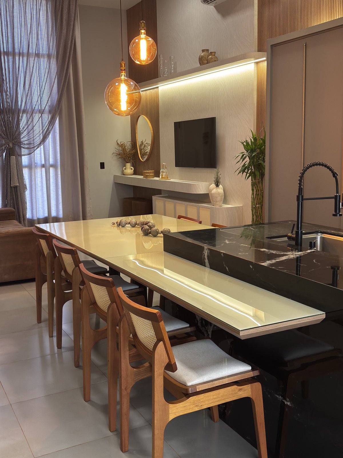 O resultado é um ambiente equilibrado e acolhedor, onde o preparo das refeições e o momento de descanso na sala se conectam de forma fluida e harmoniosa.
