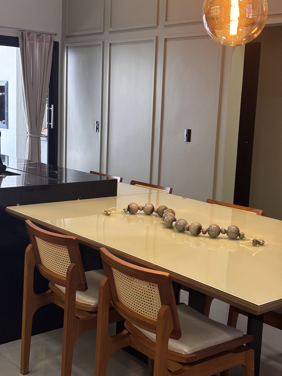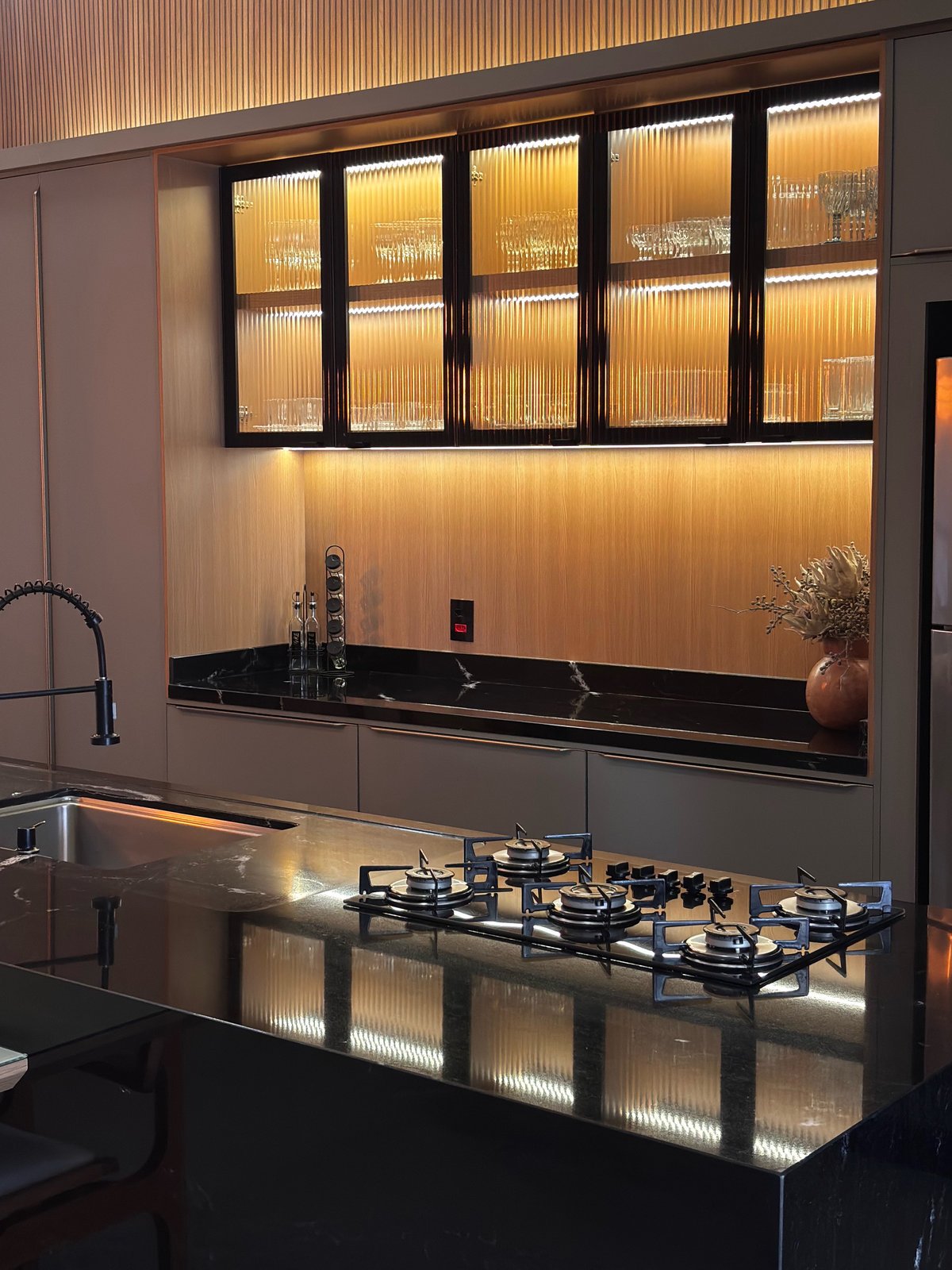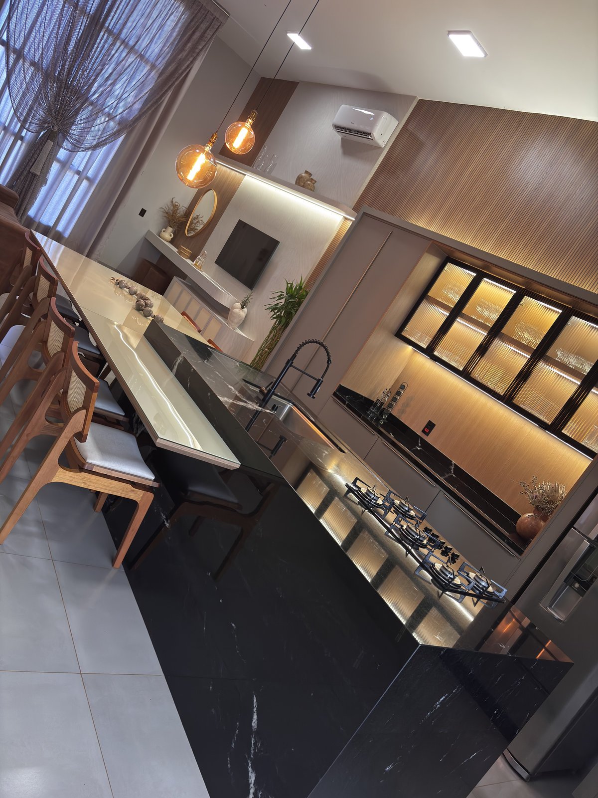 A ilha central, revestida em pedra preta, assume o papel de elemento protagonista, conferindo imponência e elegância ao conjunto. A textura natural da madeira, a iluminação suave e o desenho limpo do mobiliário reforçam o conceito de integração, proporcionando continuidade visual e valorizando o convívio.