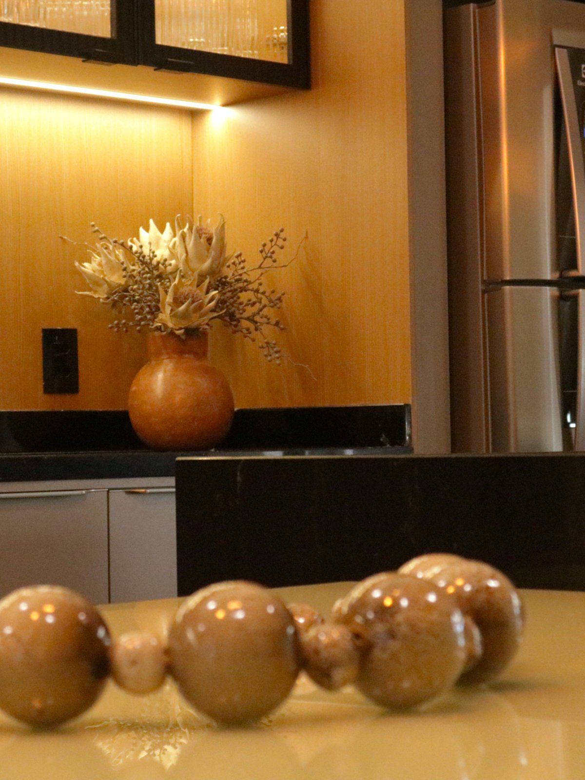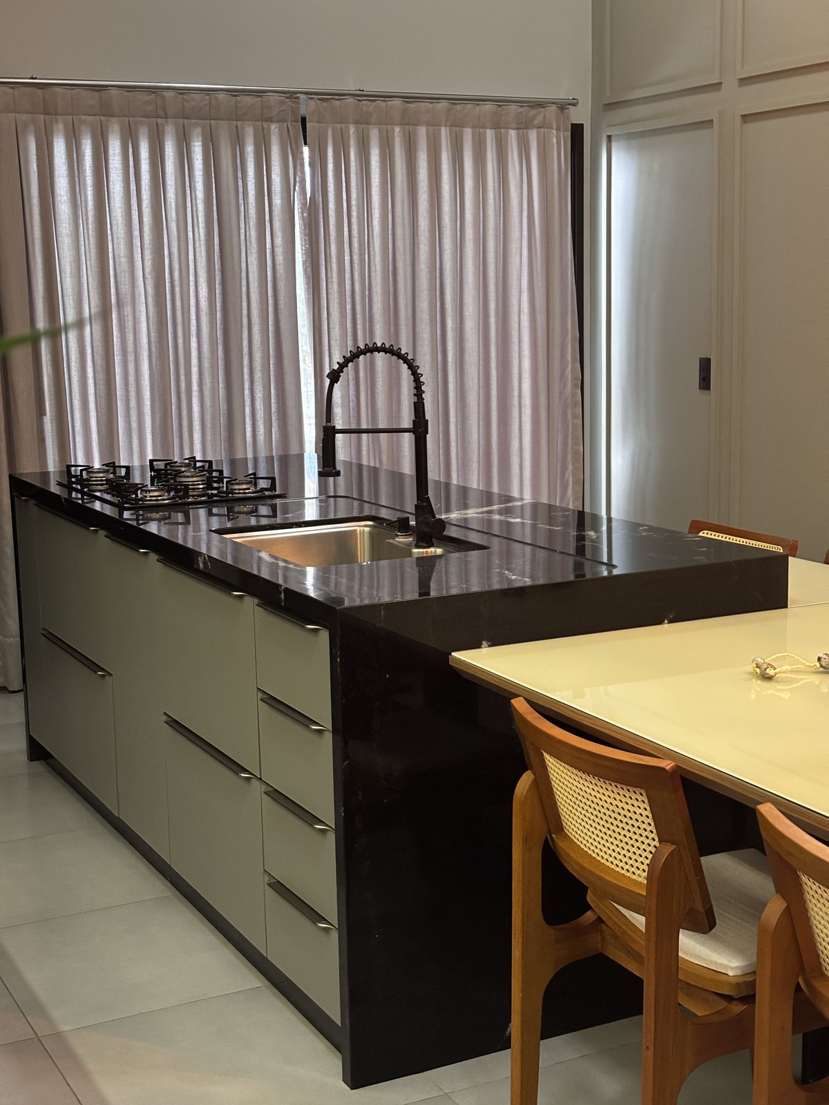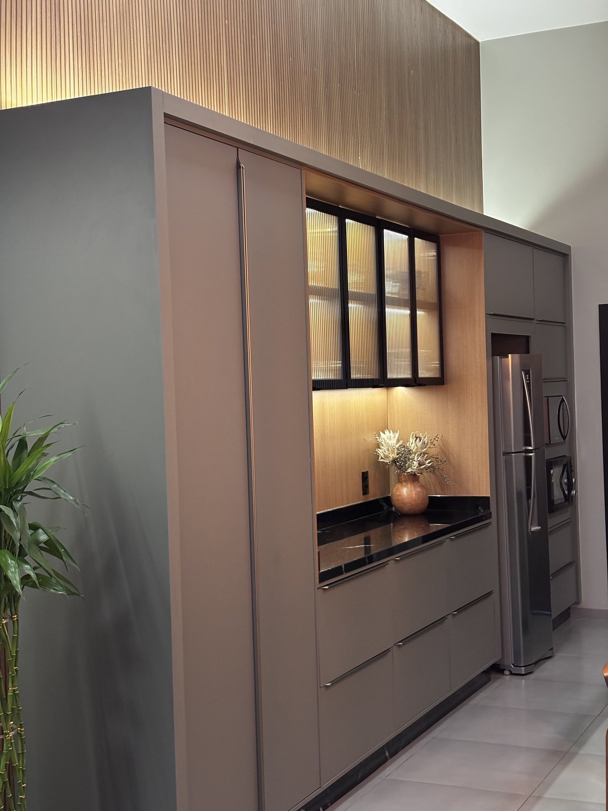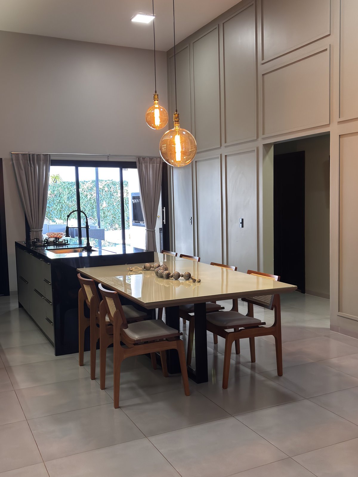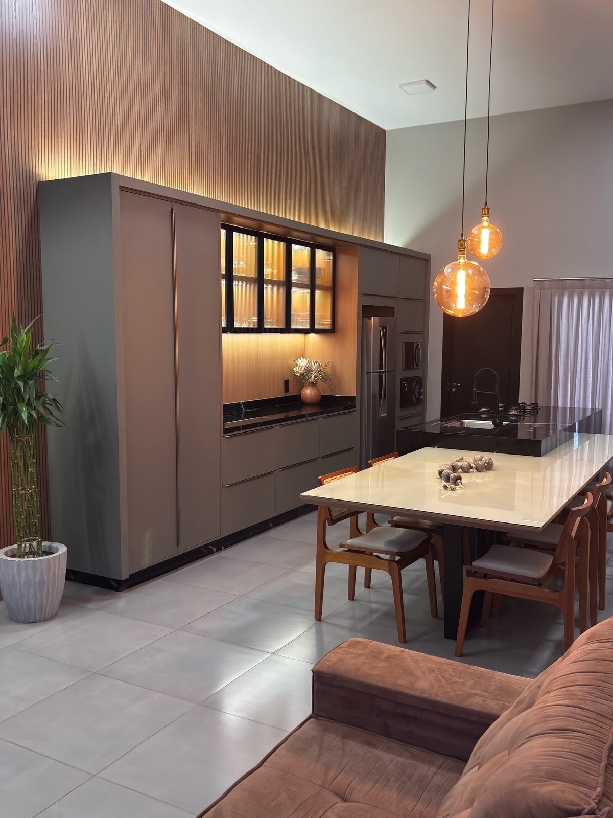 Cozinha e estar integrados compõem um espaço que reflete o estilo de vida e as prioridades dos moradores. O projeto foi desenvolvido a partir do desejo por um ambiente com pé-direito alto, tons mais escuros e uma atmosfera contemporânea que unisse funcionalidade e sofisticação.