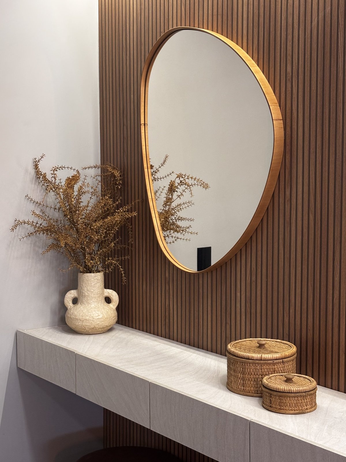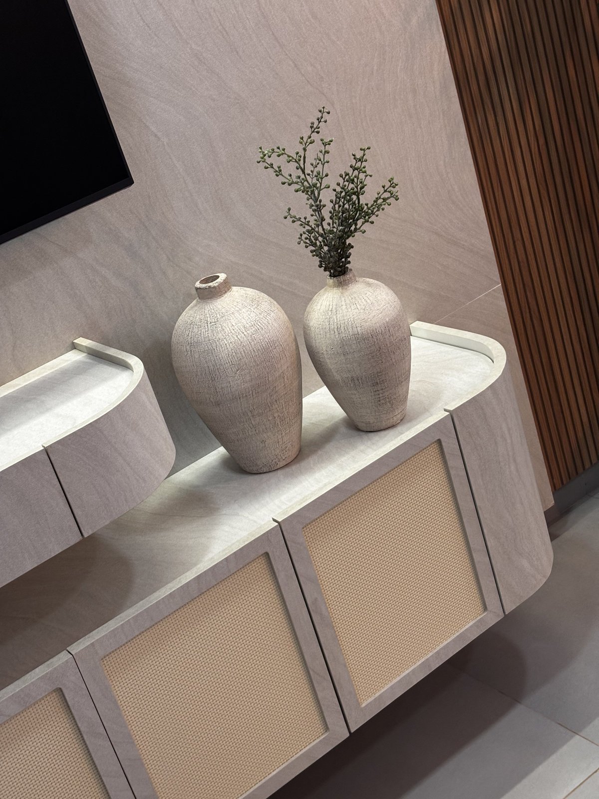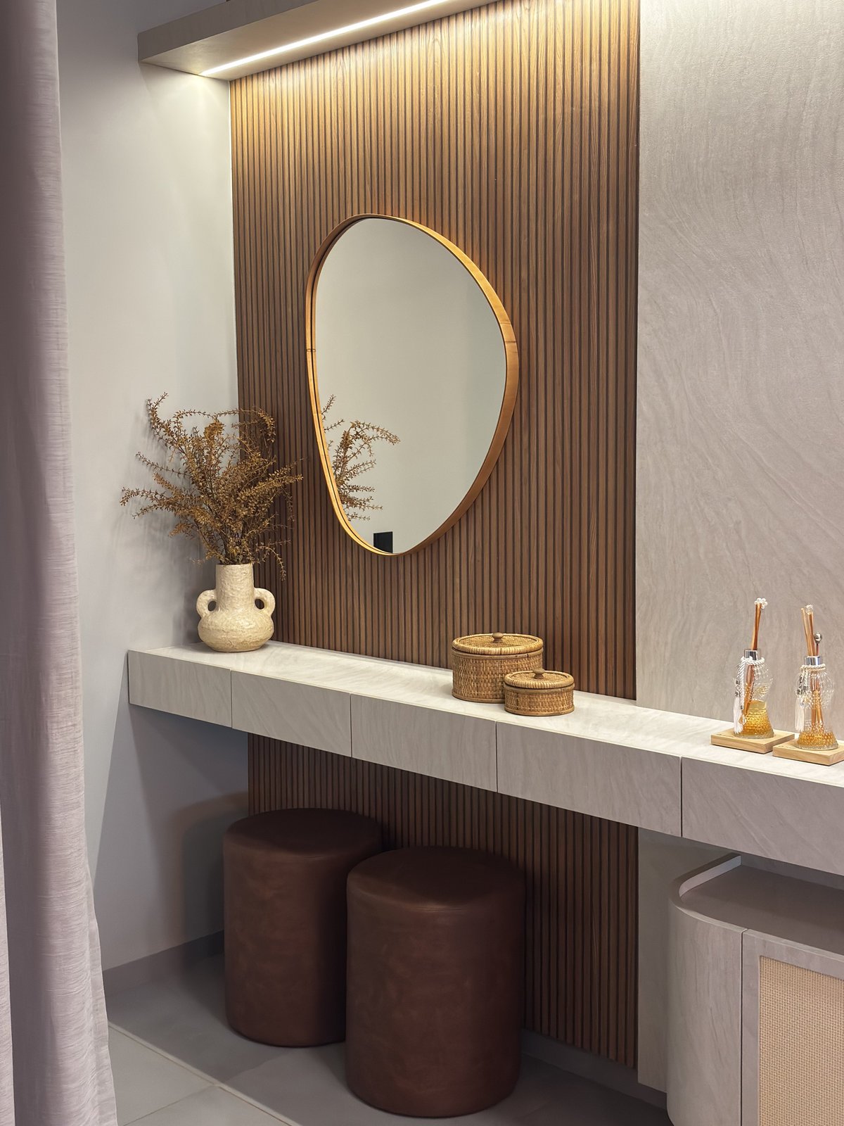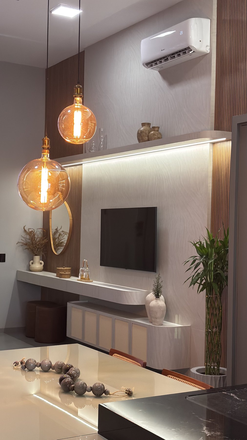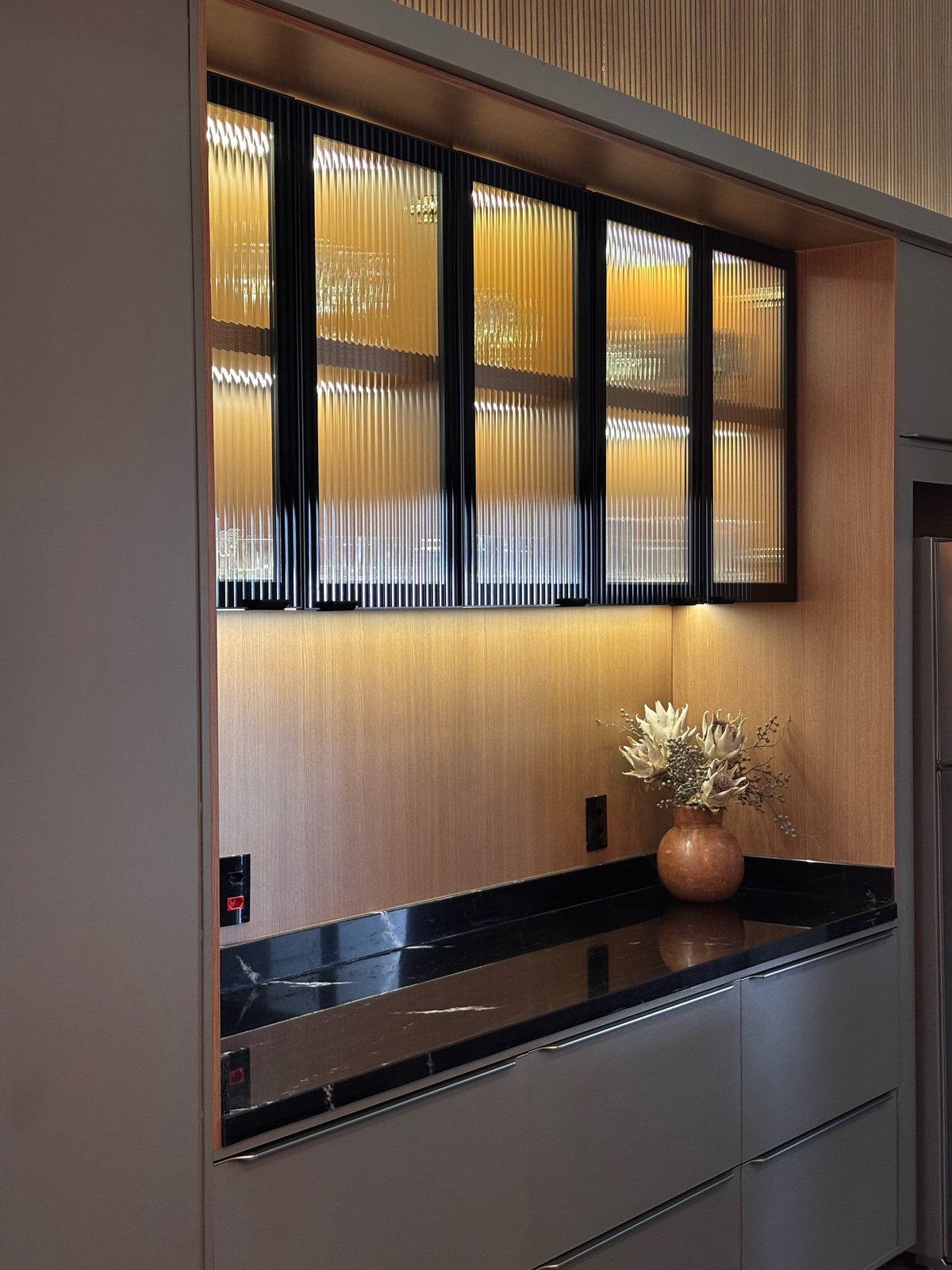 Cozinha e estar integrados compõem um espaço que reflete o estilo de vida e as prioridades dos moradores. O projeto foi desenvolvido a partir do desejo por um ambiente com pé-direito alto, tons mais escuros e uma atmosfera contemporânea que unisse funcionalidade e sofisticação.