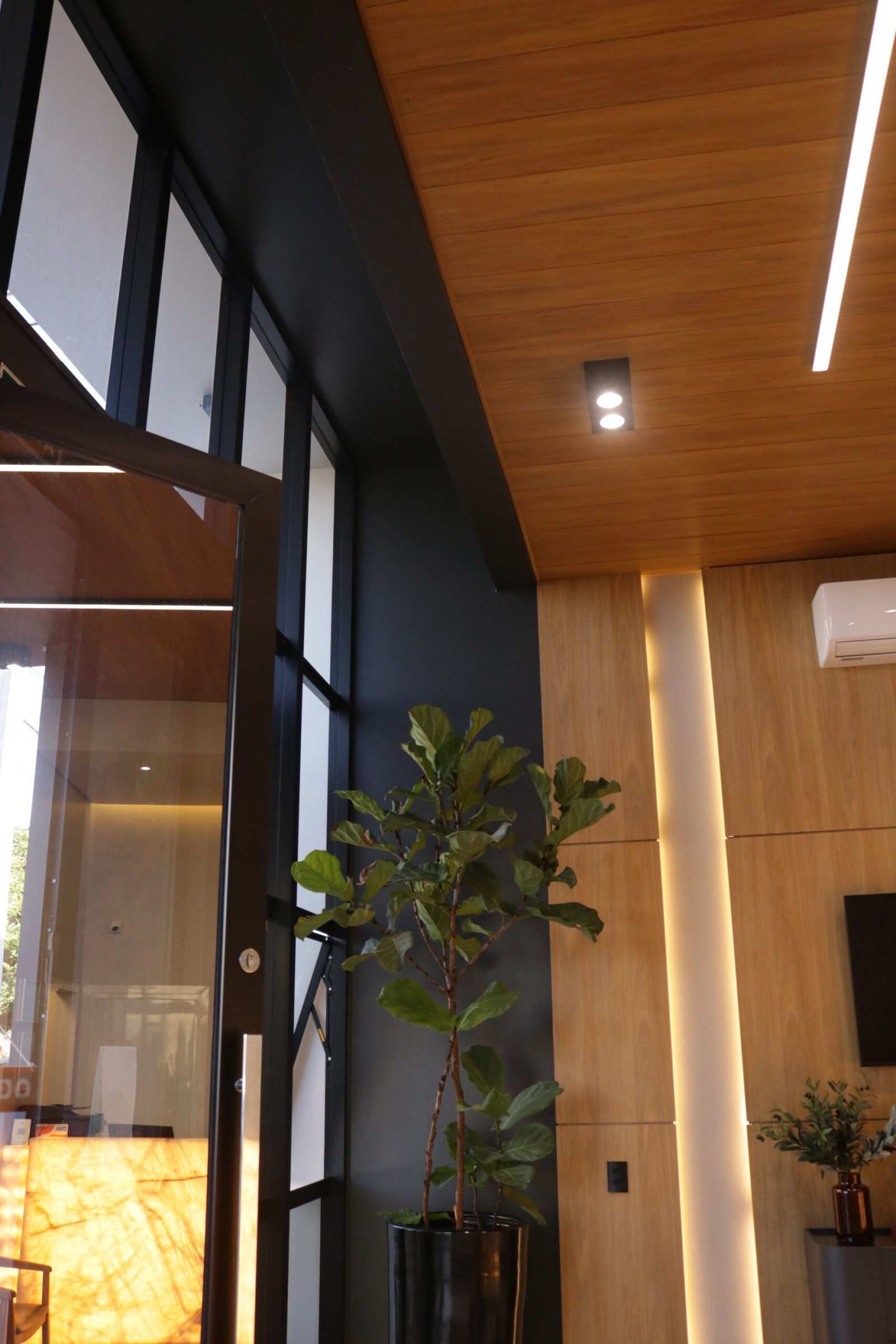 Nosso principal foco foi na iluminação, que permite criar diferentes atmosferas, adaptando o ambiente às necessidades e momentos. O grande destaque fica por conta do balcão de atendimento em ônix iluminado, uma peça que une sofisticação e funcionalidade, atraindo olhares e conferindo personalidade única ao espaço.